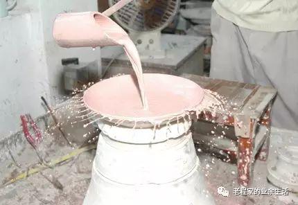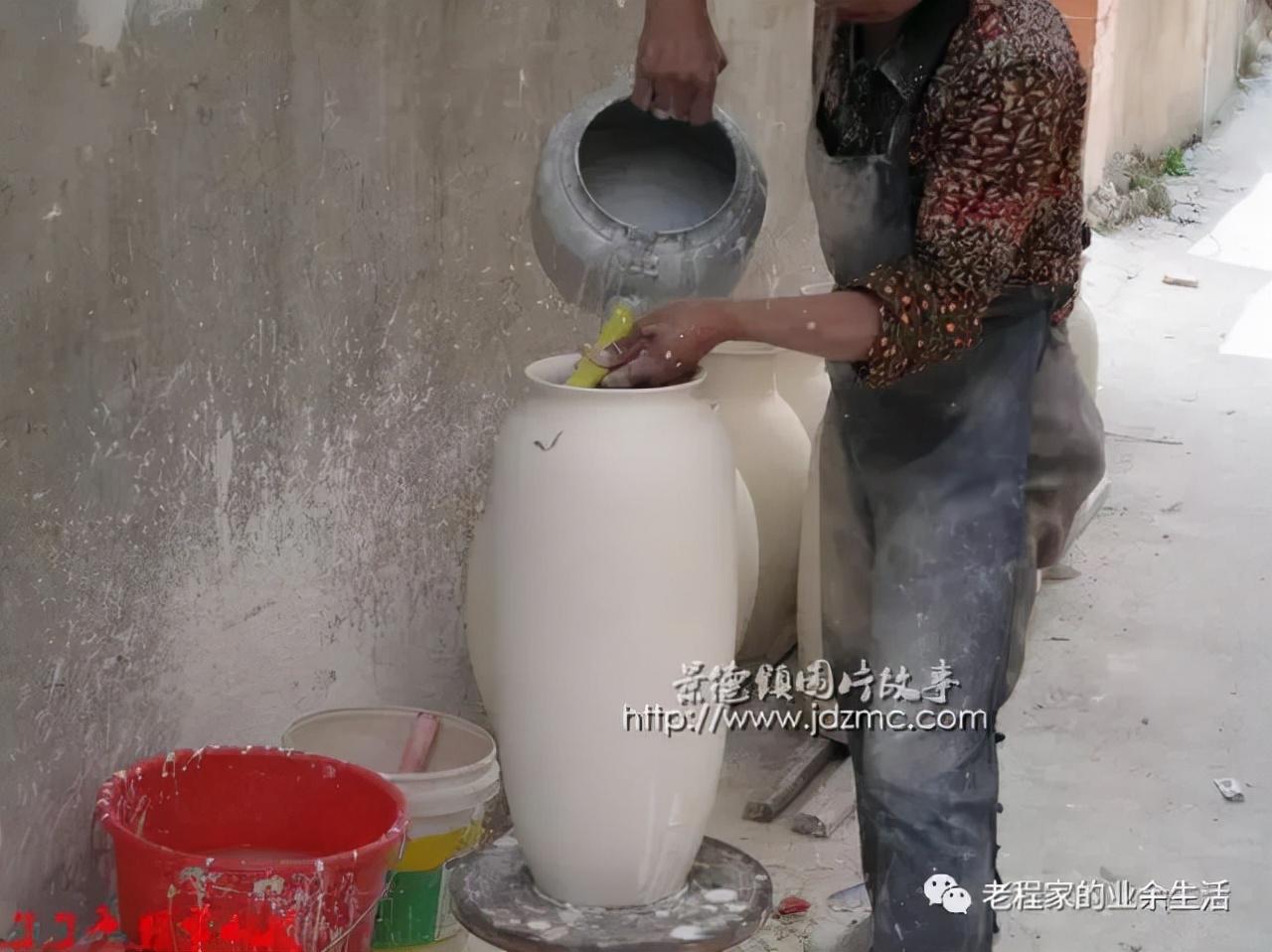 浇釉——大型器物的一种上釉工艺,是我国传统的施釉方法之一。操作时两手各执一碗或勺,舀取釉浆,向坯体上交相泼浇。