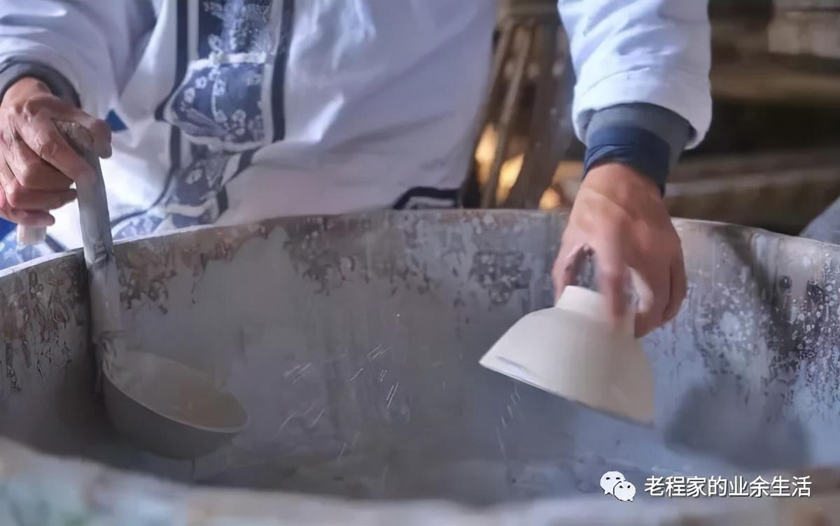 釉浆——即釉料,施于瓷坯的表面。据文献记载,景德镇制瓷用的釉浆由釉果和釉灰配制而成,主要由氧化硅、氧化铝、氧化钙、氧化钾、氧化钠等组成。釉灰是用石灰石、凤尾草烧炼而成。