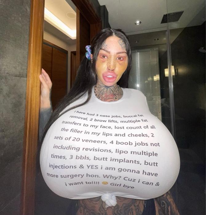 她经历了两次眉毛修理,三次鼻子整形,对脸颊和嘴唇进行脂肪转移,做了四次隆胸,以及两组20颗牙齿贴面。此外,她还经历了三次提臀和多次唇部填充,以实现她想要的“充气娃娃”外观。近,她又发布了新的内容,即将牙齿磨尖做贴面。这一次,粉丝们实在受不了了,恳求她停下来。她在社交媒体上与她73000 名粉丝分享了她的尖牙照片,并写道:“今天开始了我的新笑容!我好怕疼,但还不错!我会在几天后更新内容。我还要做复合贴面,那种不需要磨掉太多牙齿。”