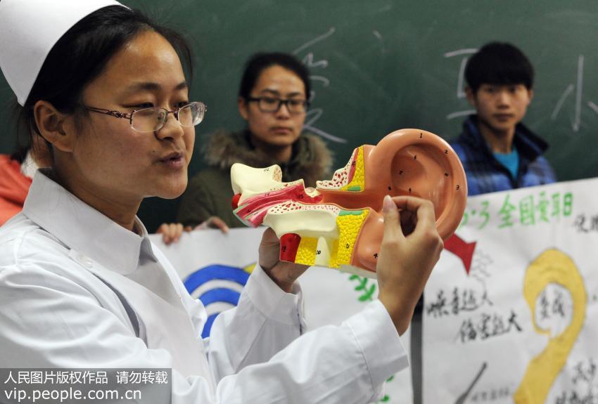 2014年2月28日,安徽省亳州职业技术学院护理专业的老师正在为学生讲解耳朵的构造及科学护耳知识。(张延林/人民图片)