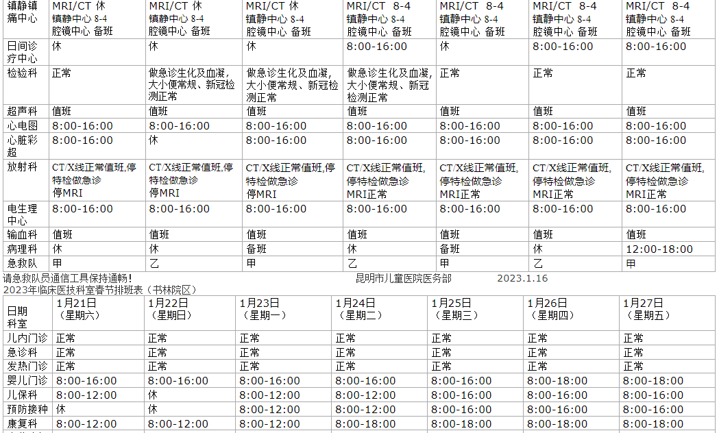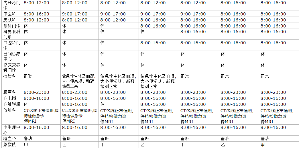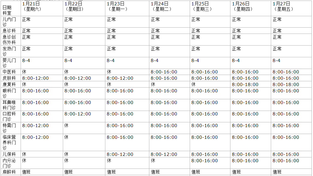 B超、化验、放射、磁共振、心电图等各项医技检查正常进行。1月21日至23日,儿科、急诊24小时应诊,康复科门诊全天正常开诊。 24日至27日,儿科、急诊、眼科、耳鼻咽喉科24小时应诊;呼吸与危重症科、妇产科、康复科门诊全天正常开诊;26至27日心内科门诊全天正常开诊;27日内分泌科门诊全天正常开诊。