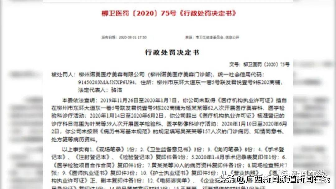 在采访中,记者注意到悬挂在诺美整形墙上的《医疗机构执业许可证》,上面显示有效期为2020年1月10日至2025年1月9日。可记者在卫生健康委员会官网上查询到,诺美整形在今年6月份才变更了诊疗科目,新增了外科门诊,而黄女士做手术的时间为今年2月份,那么当时诺美整形是否存在违规操作呢?记者已将情况反馈给柳州市卫健委以及柳州市卫生计生监督所,当地相关部门已介入调查。