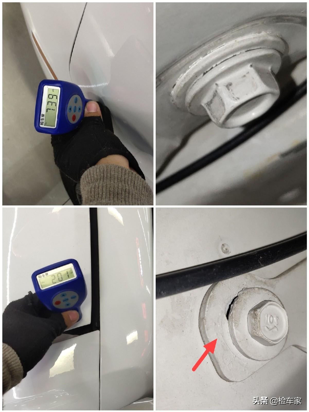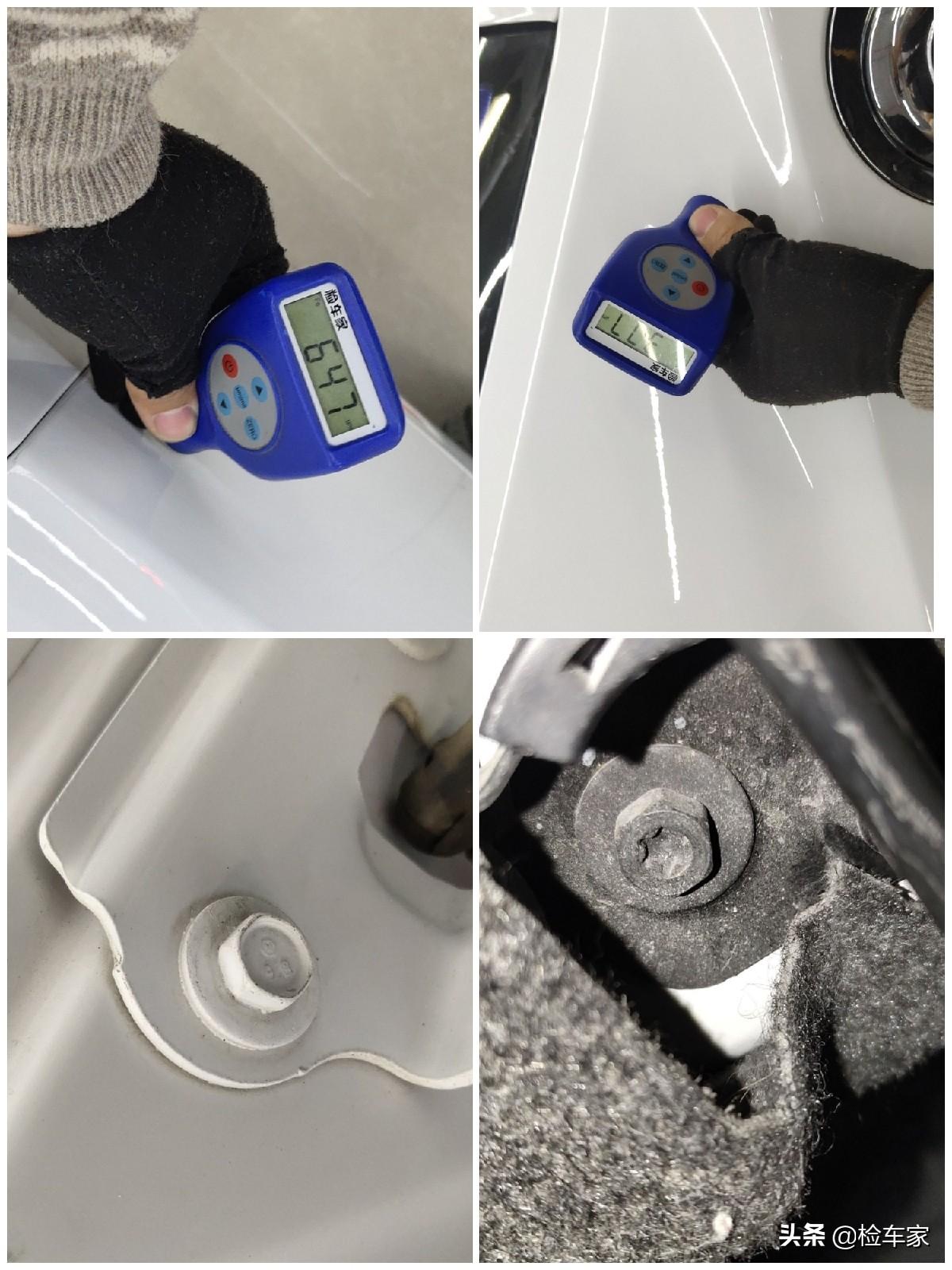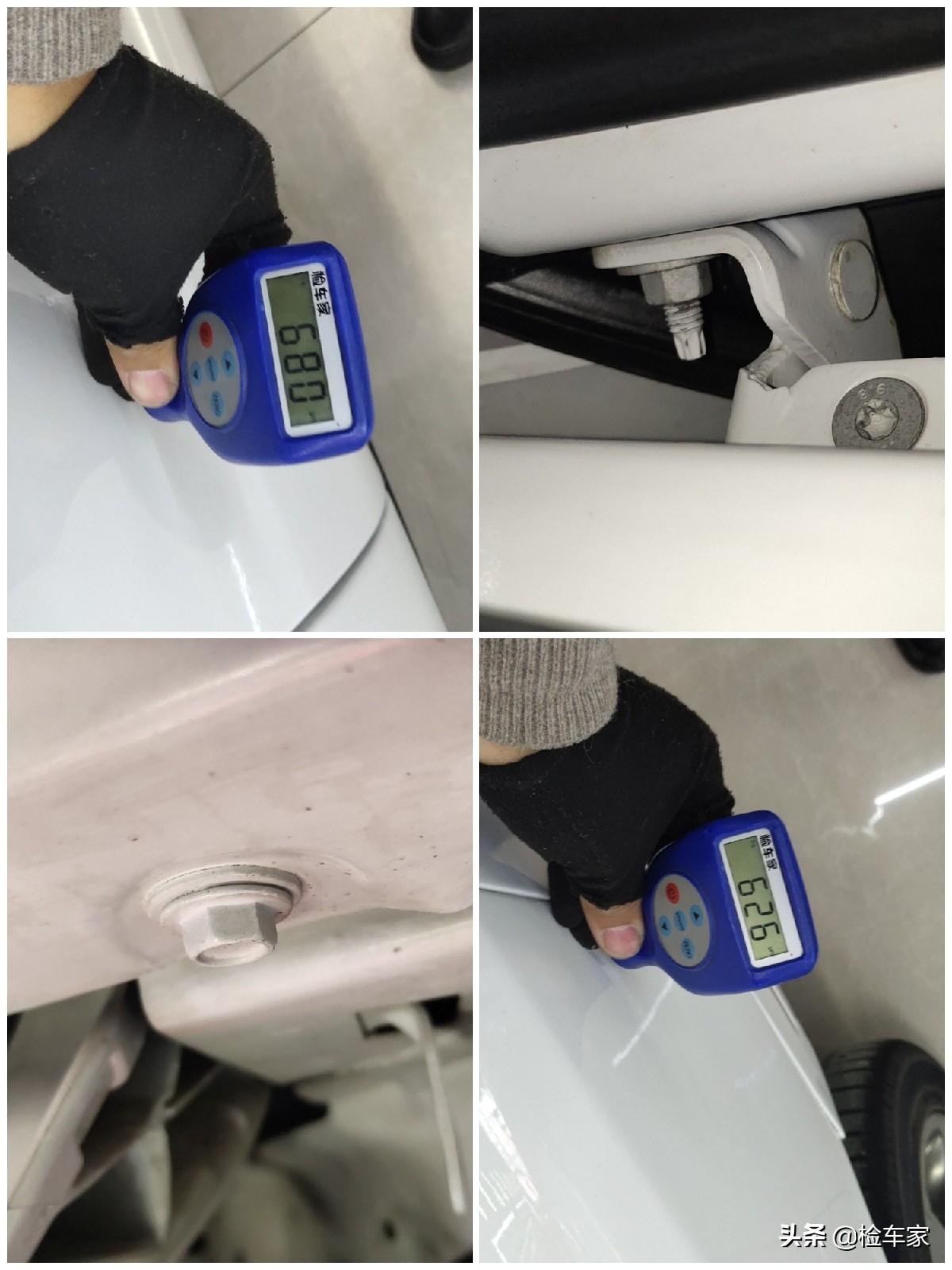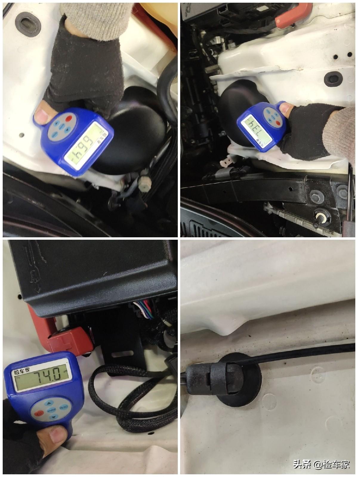 左右两边的减震包和翼子板边梁也都没有问题,漆面厚度在正常范围,表面也没有变形钣金打胶焊接等不规则痕迹。目前可以确定整个车头没有大的问题。