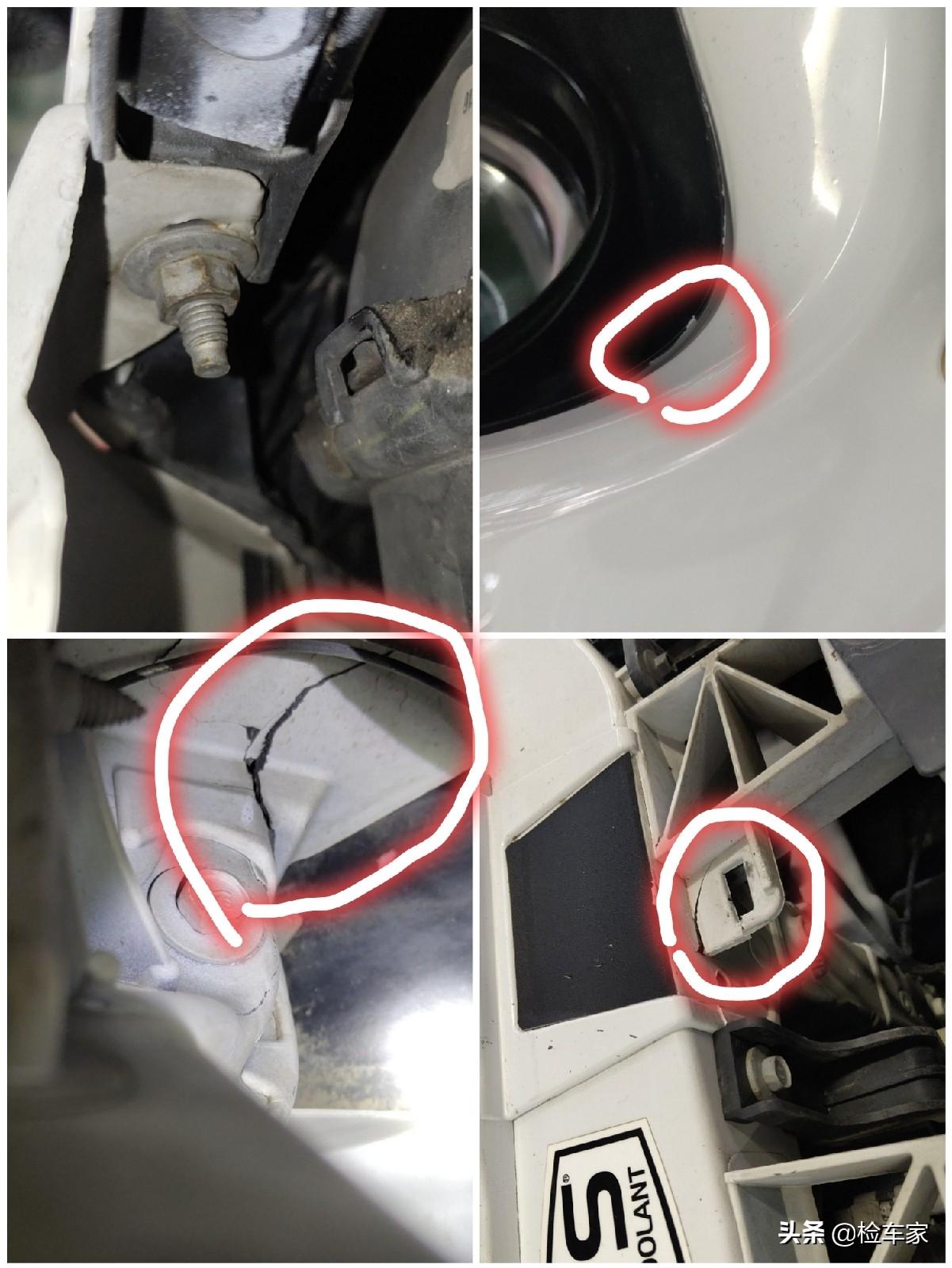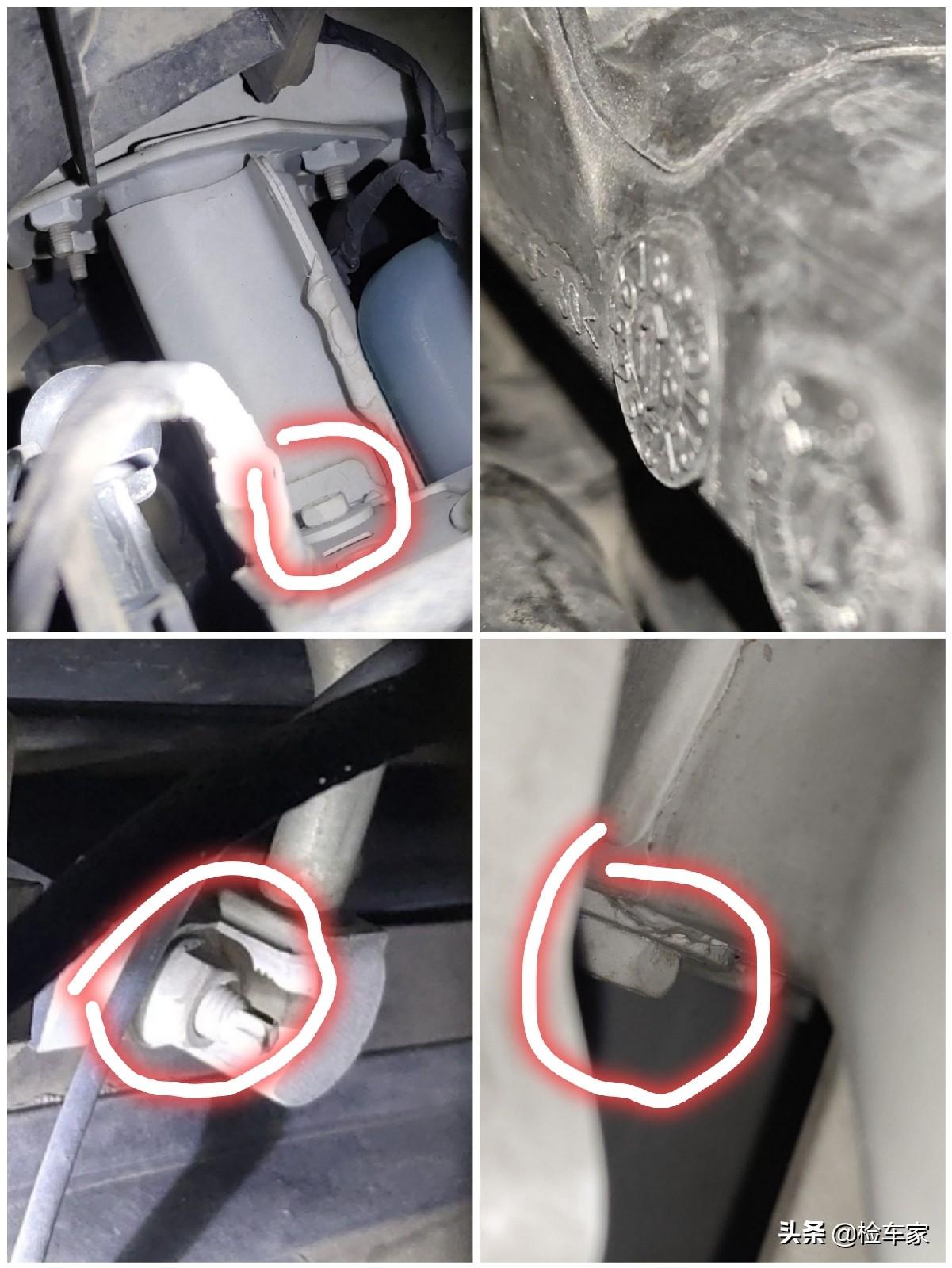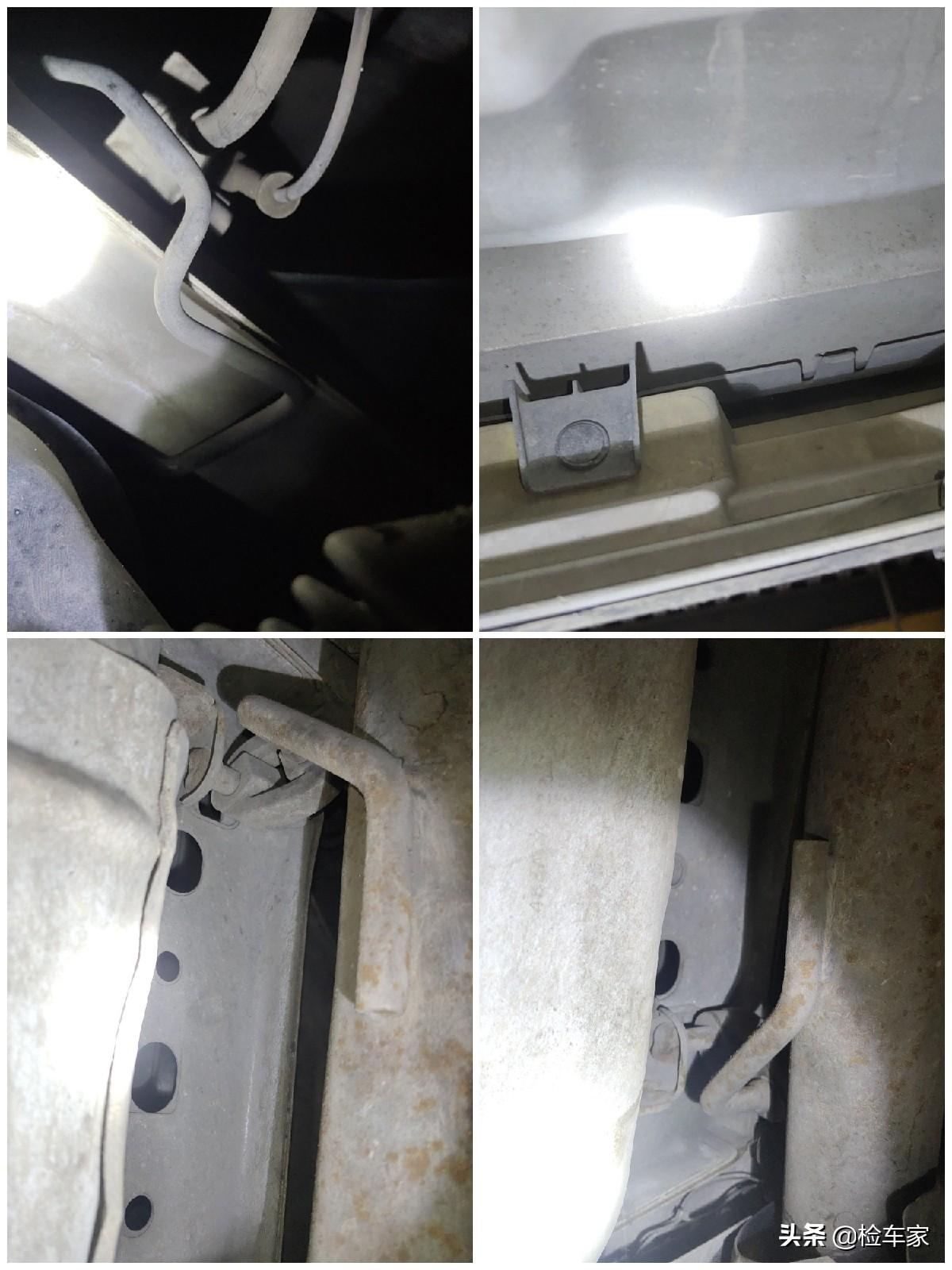 还是老规矩,从车头开始看,前保险杠有拆装修理的痕迹,再往里看,水箱框架出现了破损的裂纹,这说明车头发生过碰撞,碰撞的力度有多大呢?还需要继续往下看