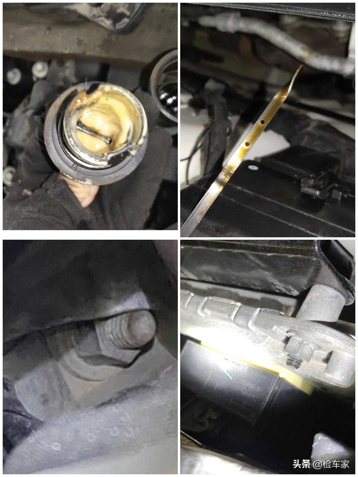 拧开机油盖看到了乳化现象,机油尺上的油液位也超过了上限,这是机油增多呀!怎么犯了日系车的毛病呢?可能保养不及时或者进了一点水,不是原厂设计质量的原因。