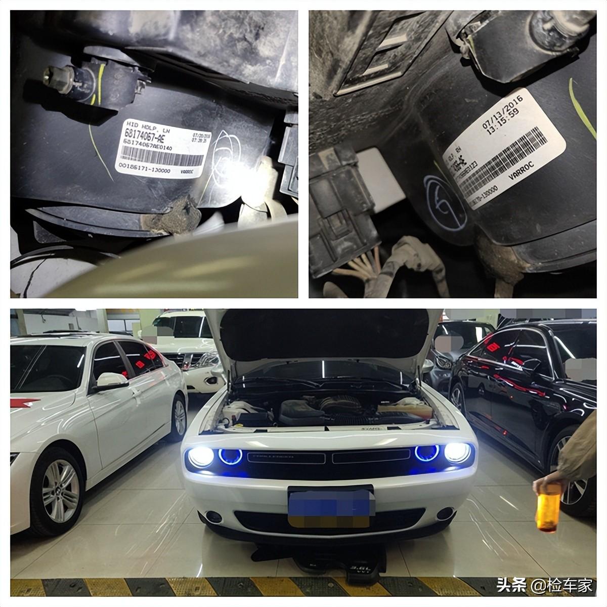 两个大灯的制造日期都是16年7月,日期没什么问题,但是大灯总成有过拆装修理,灯脚都是用烤枪修的,灯罩打开过,至于打开灯罩干什么,可能就是为了改装这个迷人又骚气的蓝色行车灯吧!真的是别具一格,有一番独特的风味!