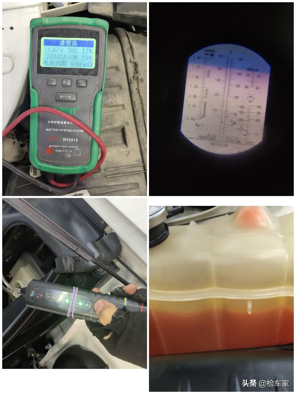 电瓶寿命剩余不多了,达到了更换标准,防冻液不缺,冰点也够,刹车油也没有问题。