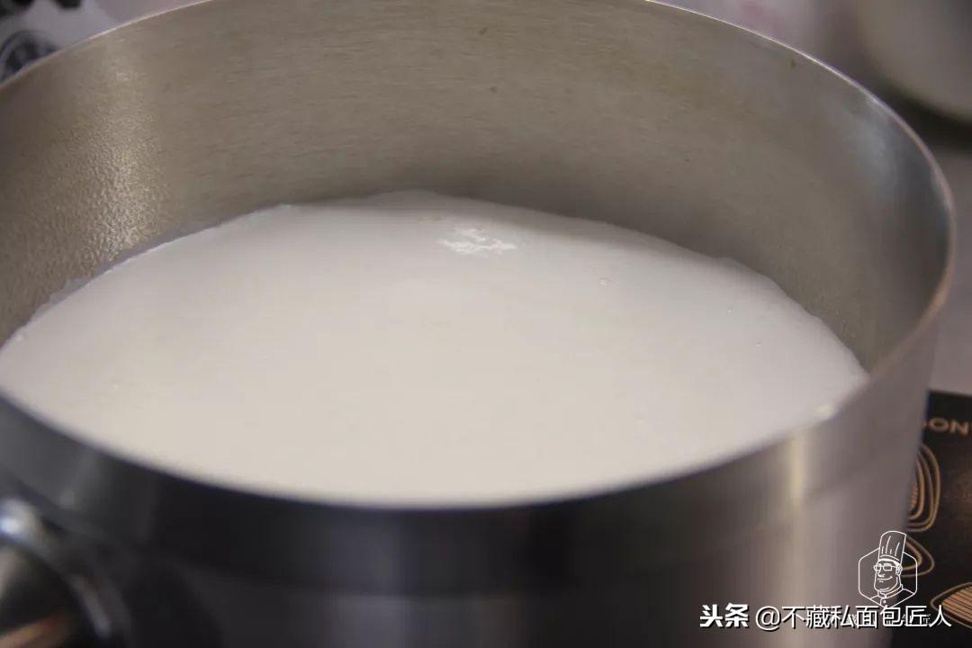2、这款面包用的牛奶含量比较高,因牛奶中主要的物质是蛋白质,所以需要进行煮沸晾凉再使用,以免面团筋度过高,增加搅拌难度。切记哦!