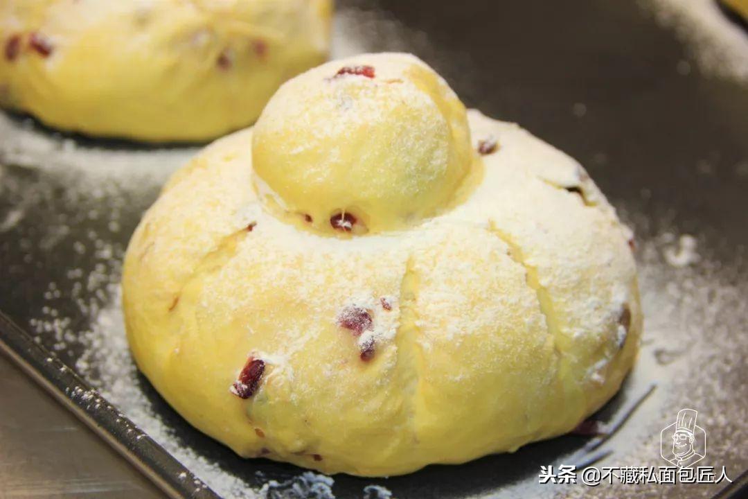 整形:大小面团分别滚圆,底部捏紧,再将擀面棍底部粘小许面粉,在大面团顶部压下去,再将小面团放至大团团上方,再摆入烤盘。