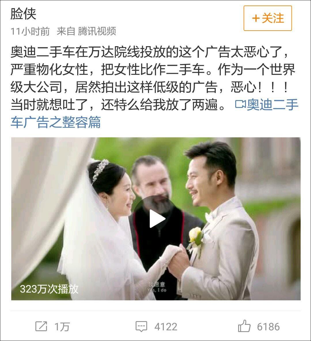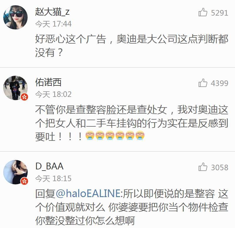 现在百度搜索关键词“奥迪广告,把女人当做牲口检查”,