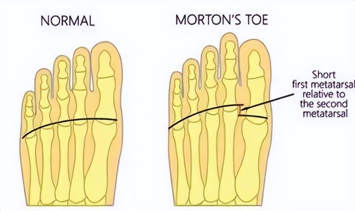 在外观上,患“莫顿脚趾”的人第二脚趾长度长于大拇脚趾,是第二跖骨比第一跖骨长造成的。