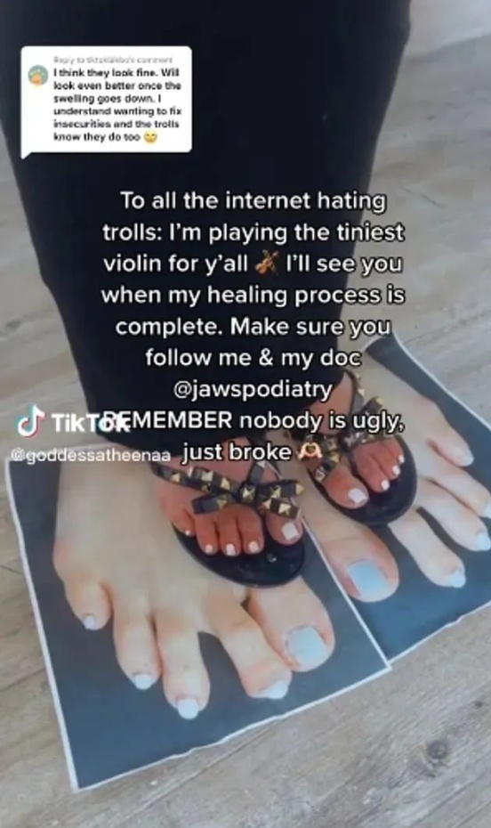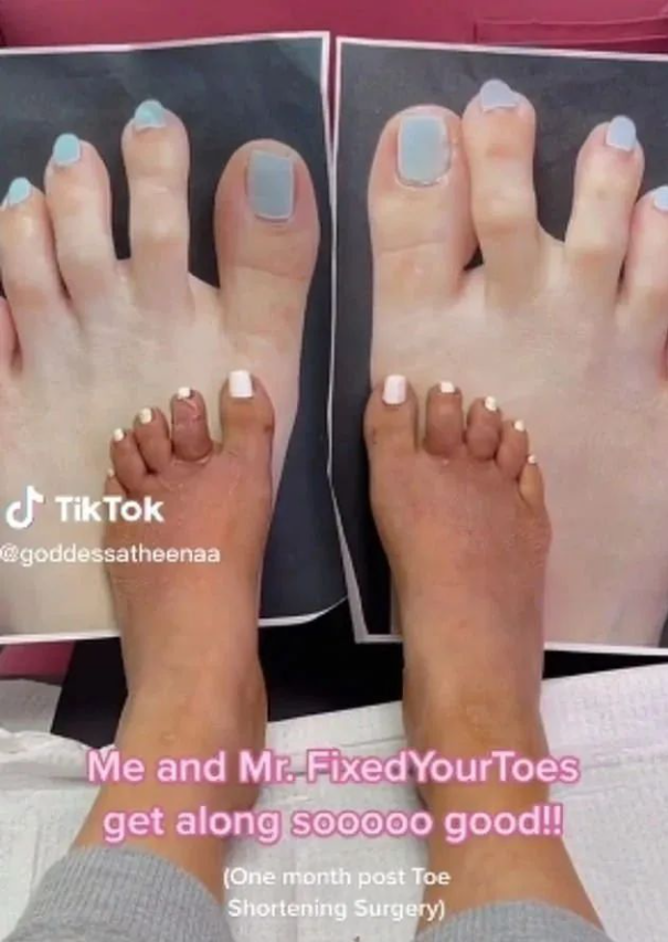 据她描述,恢复期相当顺利,她还把脚趾整形和隆胸手术比较了一番,第一天疼痛“不算太严重”,她的脚趾只感到“压力和紧张”…