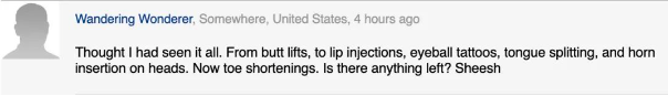 “我以为我已经看遍了。从臀部提升术到唇部注射、眼球纹身、舌头分叉和头上植角。现在又有脚趾缩短。还有别的吗?妈的…”