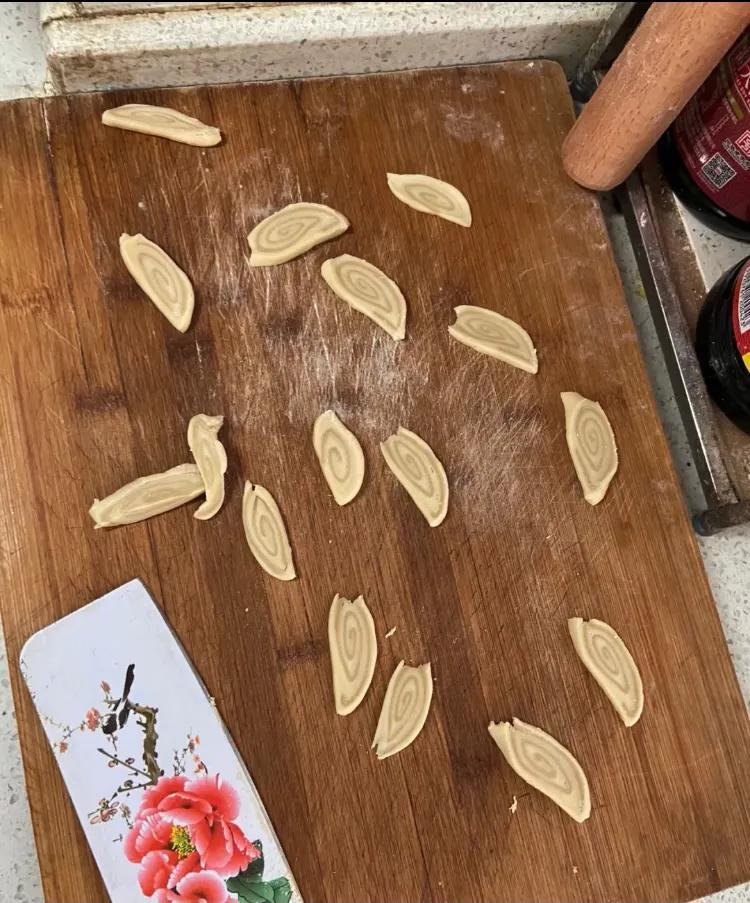 3、卷面团要卷紧,切面片要切薄,这样口感更酥脆。