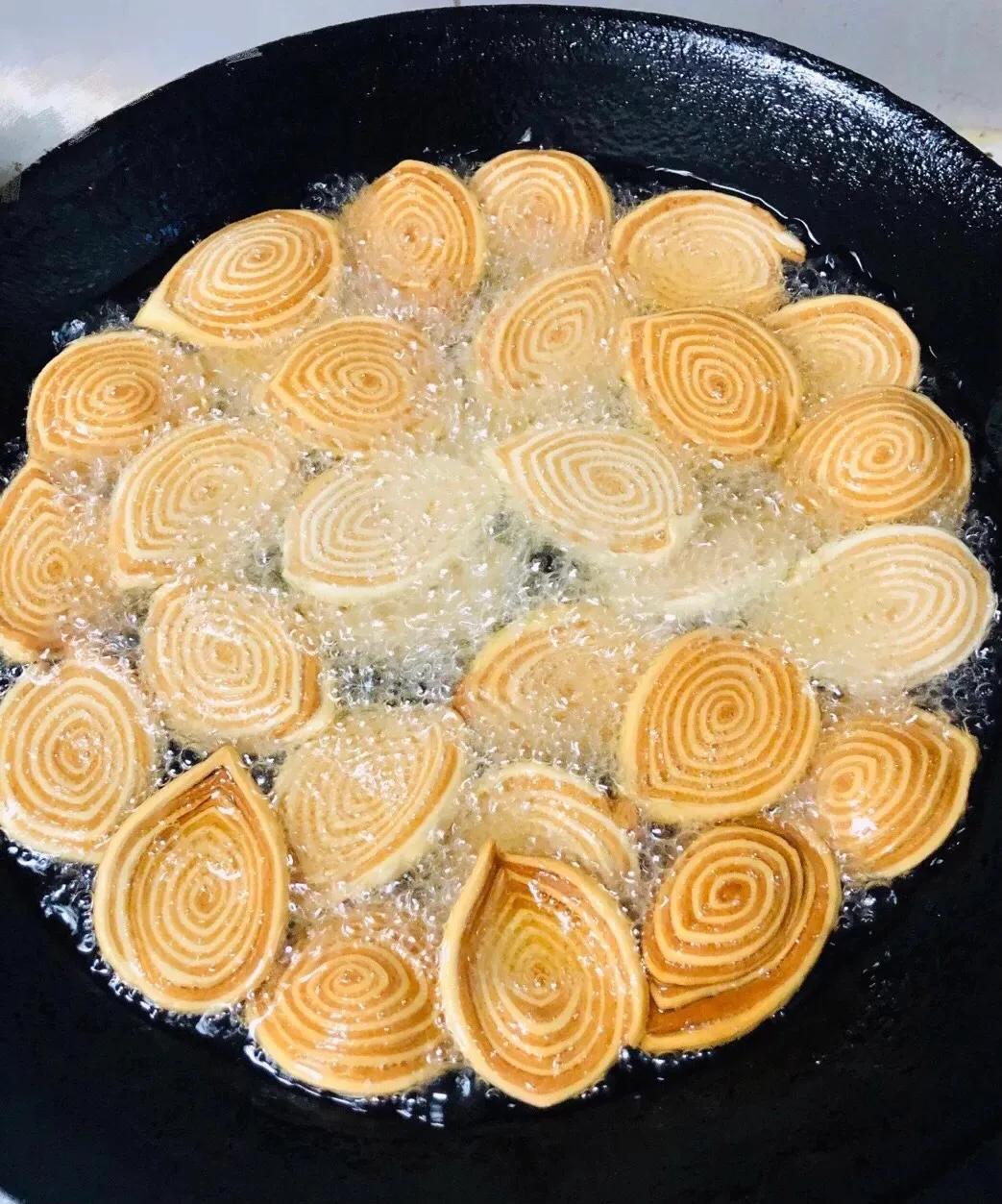 起锅烧油,油温五成热时,把切好的薄片放入锅中,中小火油炸2分钟,用铲子不停地翻动,让猫耳朵受热均匀,炸至颜色金黄,都漂起来后即可捞出沥油。