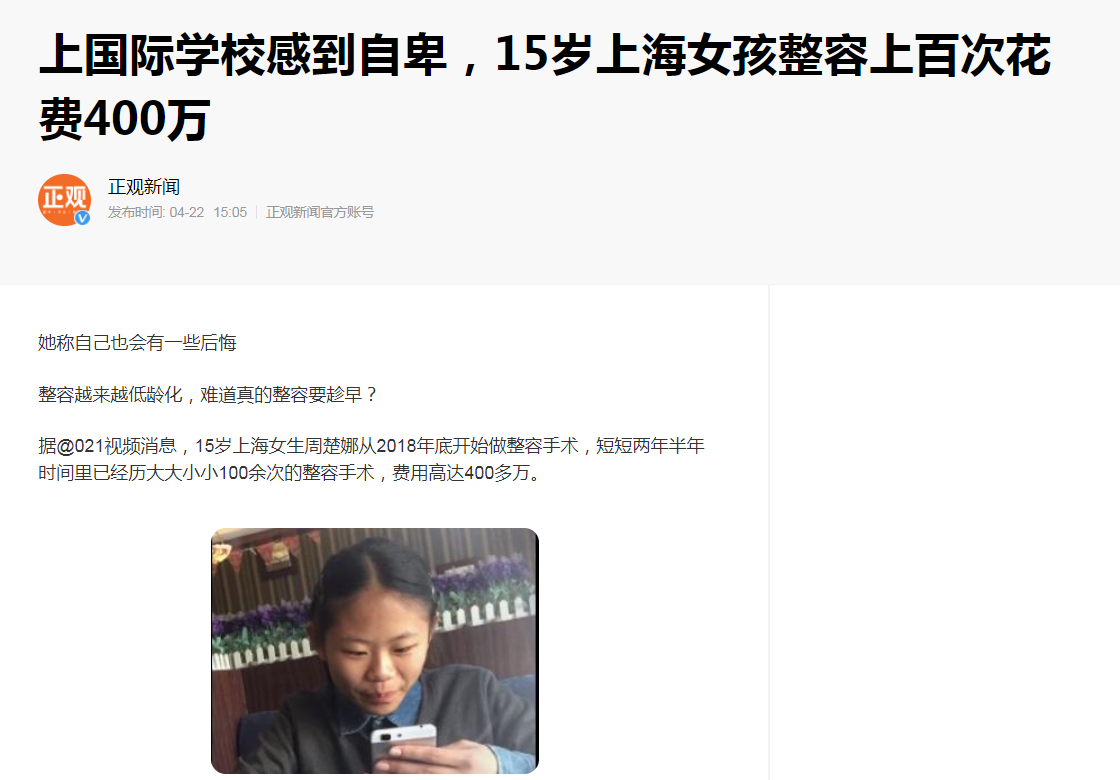 周楚娜不同于其他的小演说家,年仅15岁的她,从13岁开始整容,光双眼皮做了8次,鼻子做了6次……