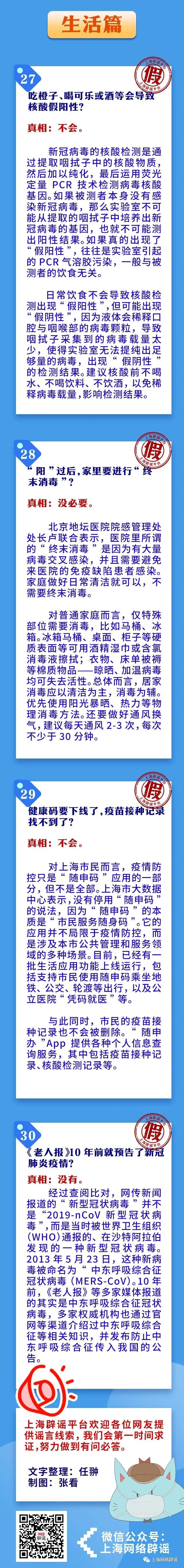 对此,上海辟谣平台梳理了近期热传的谣言,按照“预防篇”“症状篇”“调节篇”“生活篇”4大主题分类,并同时附上医学专家、机构的建议和意见,希望能为公众呈现一份实用的“防治宝典”。