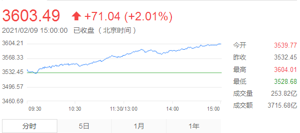 截至9日收盘,沪指报3603.49点,涨2.01%;深成指报15630.57点,涨2.36%;创指报3334.24点,涨1.71%。