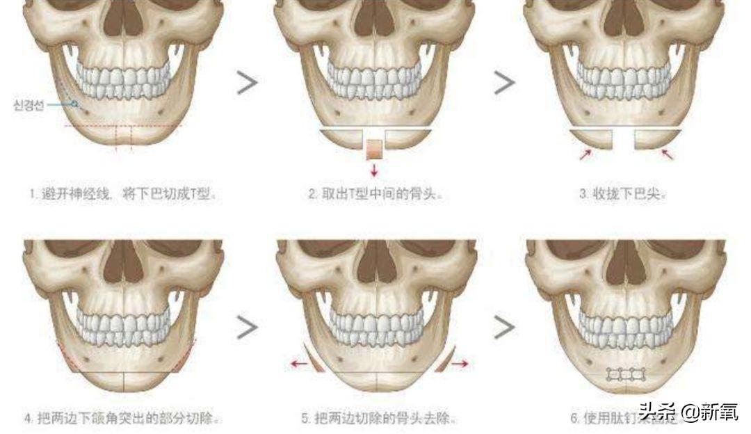 Vline手术的部分是把她的下巴切成T型,去掉中间的一部分骨头,再修剪骨头边缘,主要目的就是让脸小一点...