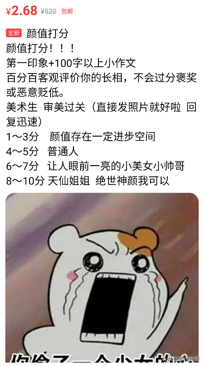 不知道自己的长相到底是美还是丑?如今,电商平台上出现了一种“颜值打分”的服务,你只需要购买这项服务后,发照片给卖家,对方就能为你的颜值打分。请陌生人给自己的颜值打分,你能接受吗?