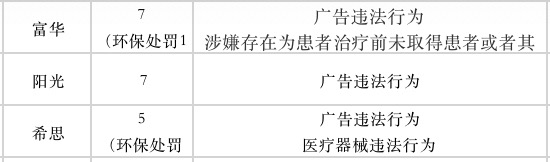 记者在启信宝平台对各家整形机构进行了资质查询,数据显示,各家医美机构均受到过行政处罚,其中富华和阳光整形受到的处罚多,大多涉及对整形项目虚假宣传,夸大宣传效果。希思因受到5起行政处罚位居第三,曾因存在医疗器械违法行为和无资质开展未规定手术被处罚,还存在项目虚假问题,消费者所做项目和套餐上不符。