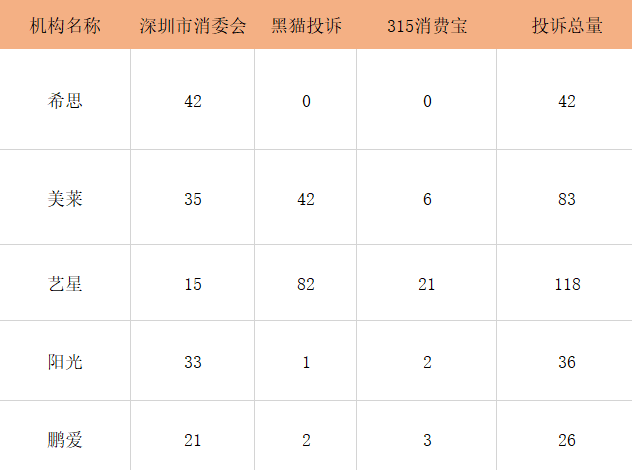 根据深圳市消委会近几年的投诉数据显示,希思投诉量排第一,其次是美莱、阳光,均超过30起。而加上黑猫投诉、315消费宝的全国数据来看,艺星投诉量排第一,共100多起,并且投诉几乎都未得到处理。