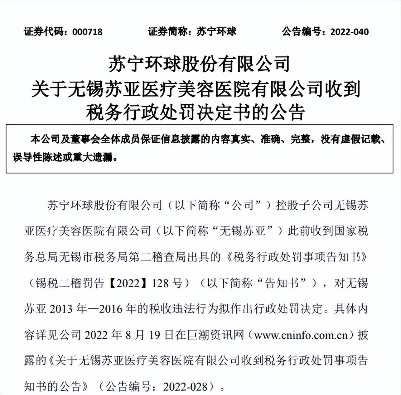近日,苏宁环球股份有限公司发布《关于无锡苏亚医疗美容医院有限公司收到税务行政处罚事项告知书的公告》。