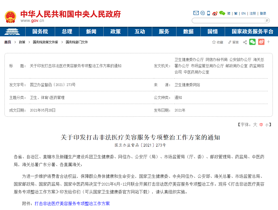 2021年5月,卫健委、中央网信办、公安部办公厅等八部门又联合下发了《关于印发打击非法医疗美容服务专项整治工作方案的通知》,于2021年6月-12月在全国范围内展开了打击非法医疗美容服务专项整治工作。