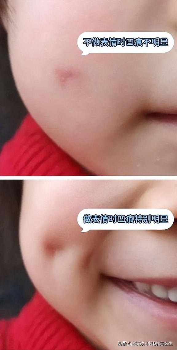 第三种是表情凹,这也是很多家长问到的,就是孩子疤痕恢复好了以后,表面上看是平整的,但是一做表情就会出现的凹陷,用手摸也能摸出来。这个是因为皮下组织黏粘、脂肪缺失导致。如果是需要手术的伤口,建议尽量选择精细美容缝合,逐层对合,避免出现表情凹。