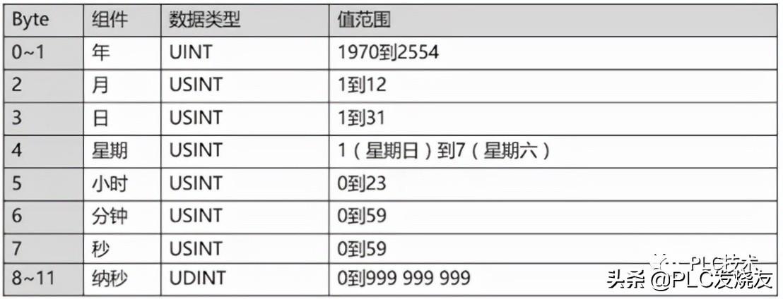 DTL数据类型使用12个字节的结构来保存日期和时间信息,12个字节中含年、月、日、星期、时、分、秒和纳秒。主要用于对系统时钟的设置和读取;DTL的每一部分均含有不同的数据类型和取值范围,指定值的数据类型必须与相应的数据类型一致。可在全局数据块或块的接口区定义,不能在变量表中定义。DTL数据类型的存储格式如图所示:
