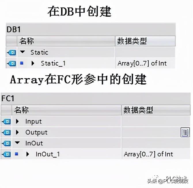 数组数据类型(ARRAY)是有数量固定且多个相同数据类型的多个元素组成;ARRAY类型可以在DB、OB/FC/FB接口区、PLC数据类型处定义;无法在PLC变量表中定义。