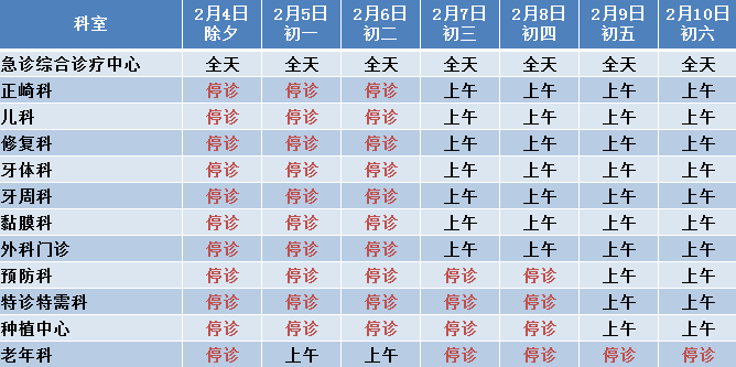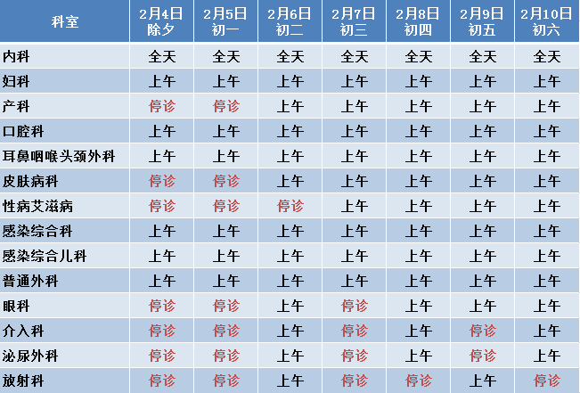 7、保健中心:2月4日至2月6日(三十至初二) 停诊,2月7日至2月10日(初三至初六)全天门诊。
