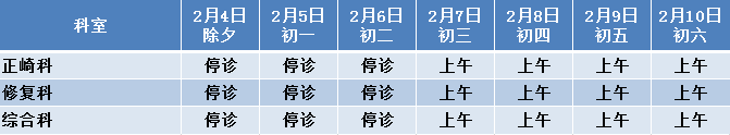 2月8日-2月10日:上午半日门诊(8:00-12:00)。
