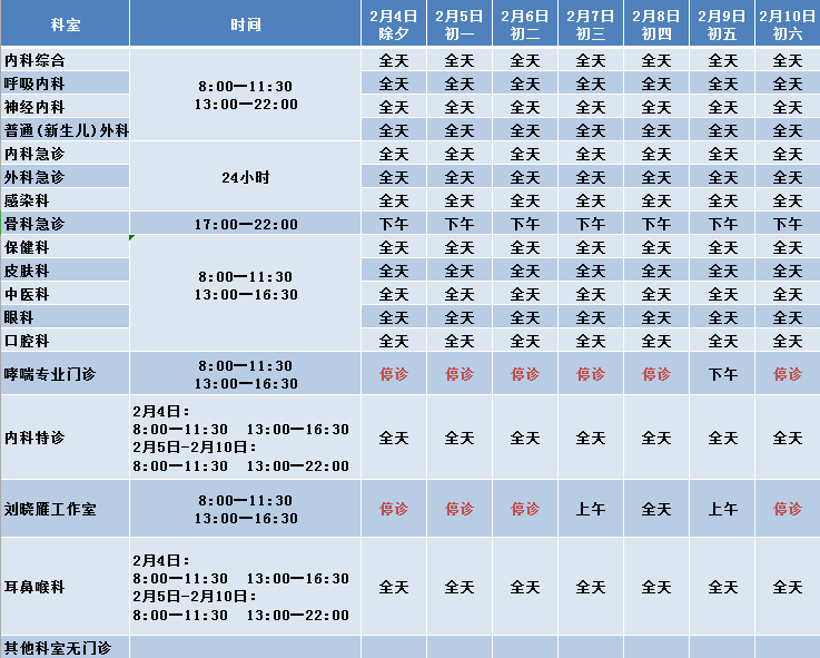 4、耳鼻咽喉头颈外科、眼科、口腔科、皮肤科:2月4日至2月10日(三十至初六)全天门诊。