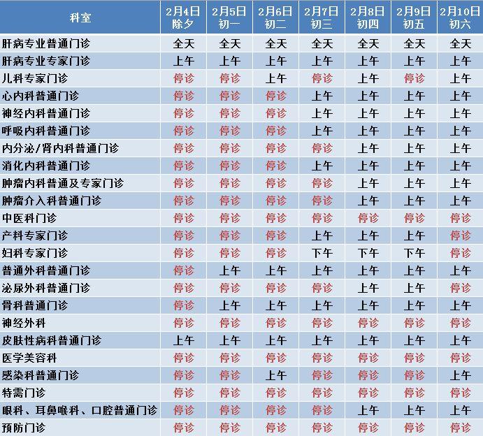 3、外科:2月4日至2月10日(三十至初六)普通门诊全天应诊,专家上午半日门诊。专业门诊以当日为准。