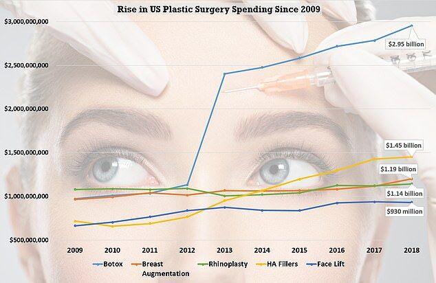 【环球网综合报道】据英国《每日邮报》4月10日报道,美国整形外科医师学会报告显示,2018年美国人在美容整形方面总计消费超165亿美元,比上年增长4%。其中,注射贡献的利润多,接下来是丰胸。