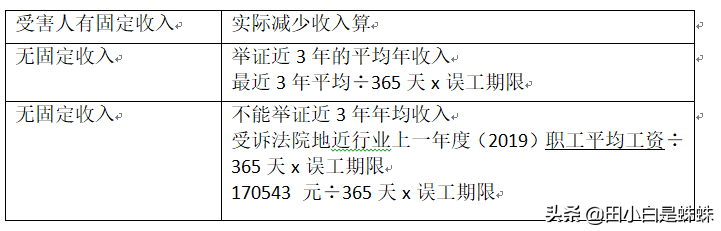 根据《高人民法院关于审理人身损害赔偿案件适用法律若干问题的解释》第20条:1.误工时间:医院出的证明;2.定残日前一天;3.实际减少的收入证明;4.无固定收入,近3年的平均收入算;5.不能举证近年的,受诉法院上一年度同行业平均收入。