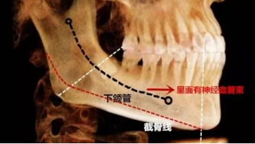 在下颌角里面的沿线位置,有一个重要的解剖结构,叫做下齿槽神经血管,要确定先要确定下齿槽神经血管的位置,截骨术中要保护好这条神经线,应该在距离下齿槽神经管下方5mm以上。