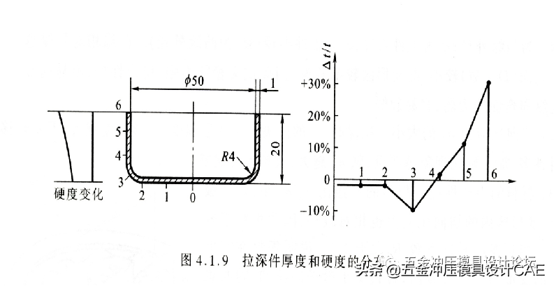 拉深后得到工件的厚度沿底部向口部方向是不同的(如图4.1.9)