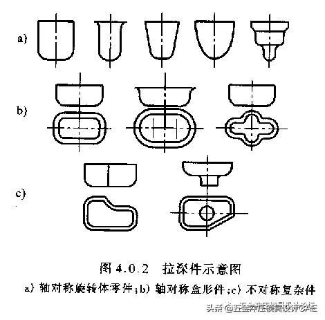 拉深是利用拉深模具将冲裁好的平板毛坯压制成各种开口的空心件,或将已制成的开口空心件加工成其他形状空心件的一种冲压加工方法。(如图4.0.1)