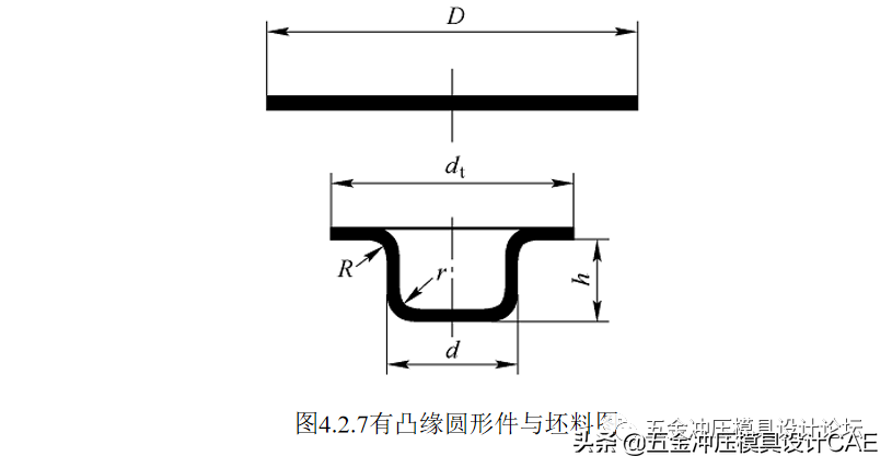 有凸缘筒形件的拉深变形原理与一般圆筒形件是相同的,但由于带有凸缘(如图4.2.7),其拉深方法及计算方法与一般圆筒形件有一定的差别。