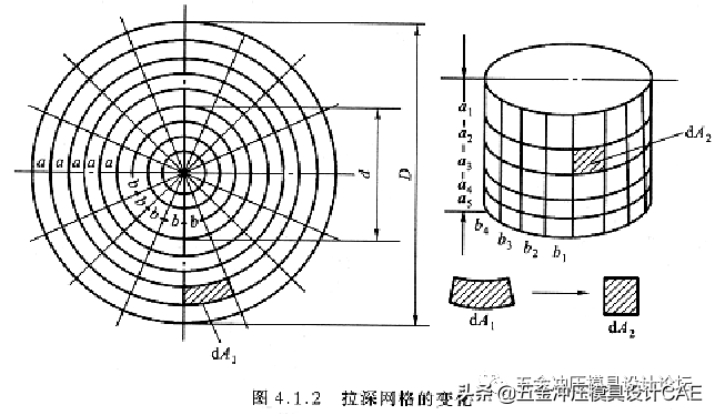 在毛坯上画作出距离为a的等距离的同心圆与相同弧度b辐射线组成的网格(如图4.1.2) ,然后将带有网格的毛坯进行拉深。
