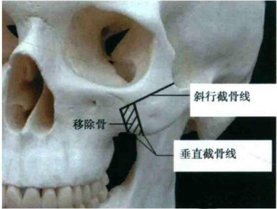 2、颧骨颧弓复合体缩小术。通过颧骨体和(或)颧弓根部的截骨,将颧骨颧弓复合体在三维空间上进行移位,对颧骨和颧弓肥大均可以矫正。根据颧骨复合体真性肥大的三个亚型,需要选择不同的截骨方式。