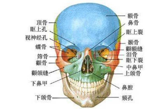 颧骨是坚硬的面骨之一,左右对称,近似四边形,外凸内凹,分别与颞骨、额骨、上颌骨和蝶骨的颧突相连接,参与眼眶的外侧壁和底壁、上颌窦的顶壁、额凹和颧弓的构成,是颅骨与上颂骨 之间的重要连接支架,对构成面颊部的外形具有重要的作用。