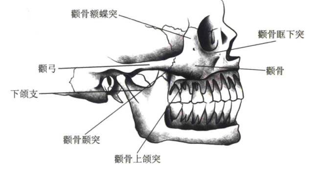 颧骨由四边形的骨体组成,有三个面、四个骨突、五个缘。