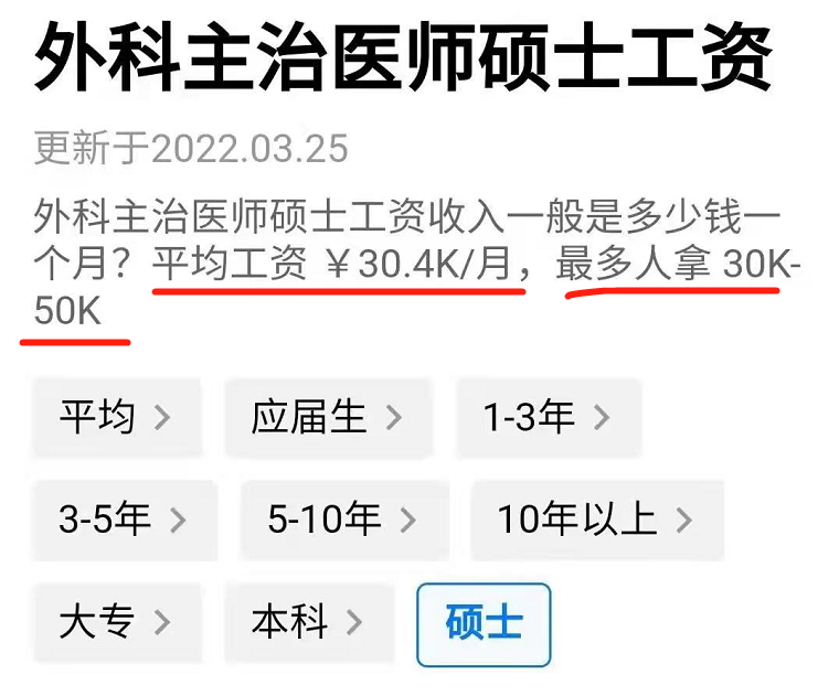 就在大家的猜测声中,主治医师的薪资被扒了出来,金额让人深感意外。数据中显示硕士学历的外科主治医师的平均月薪为3万元,赚到3-5万元月薪的主治医师人数多。网友看后直言:就这点?