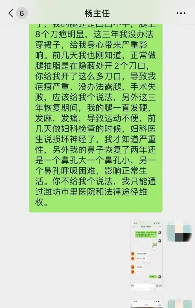 据王女士称,经熟人介绍,她曾先后于2018、2019年去潍坊市市立医院医疗美容科找医生杨柏军做了腿部抽脂、脸部填充、腹部抽脂、鼻子和下巴假体填充等一系列整形手术,花费近6万元。