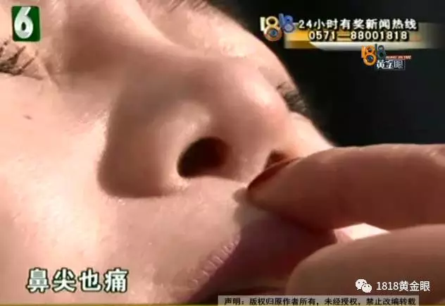 彭女士:“打眼影,用那个点一下,都有点痛,都一年了还痛,眼睛也痛,鼻子也痛,耳软骨还露出来了这里,鼻尖也痛,这里还鼓个包,有增生。”