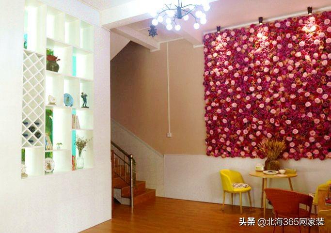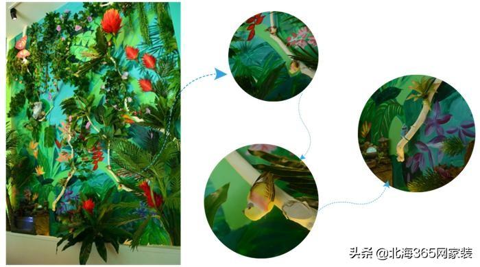 首先,你们看到的这面绿油油的背景墙底部是设计师用涂料手绘画上去,在仿真的花草下面有设计师设计自己花的花花草草,这样才会显得有森林密集的视觉。然后,就是仿真花草,虽然网淘可以淘到,但是要一件件搭配,一枝干支还是一只小鸟都需要合理的摆放才不会让背景显得突兀。摆放这些东西设计师还要去微调,所以大家看着很美的东西后得以呈现,是花费设计师很多的心血的。