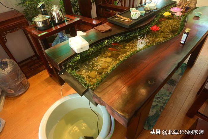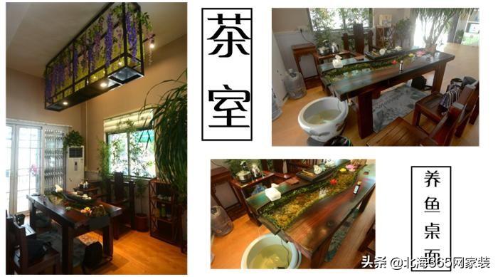 茶室区有创意就是这个可以养鱼的茶桌。据说是老船木做的茶桌椅,茶桌中间放置着循环流水养鱼,随着水流动鱼儿在水中游来游去,人们在两边品茶交谈,有景有茶再配上音乐,瞬间要作诗一首!